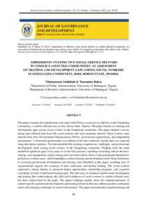 Abdullahi, Muhammad and Bukar, Kanumbu (2025) Impediments to Effective Social Service Delivery in Conflict Affected Communities: An Assessment of Training and Development Gaps among Social Workers in Gongulong Community, Jere, Borno State, Nigeria. Journal of Governance and Development (JGD), 21 (1). pp. 66-80. ISSN 2289-4756