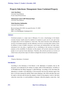Abu Bakar, Azizi and Mohamad Rapi, Muhammad Ashraf Aliff and Sallehuddin, Mohd Rashdan (2020) Property Inheritance Management Issues Unclaimed Property. Webology, 17 (2). pp. 874-881. ISSN 1735-188X