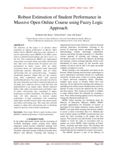 The objective of this paper is to develop robust estimation of student performance in Massive Open Online Course (MOOC) using fuzzy logic approach. A massive open online course (MOOC) is an online course aimed at unlimited participation and open access via the web. This evaluation for MOOC was implemented using online assessment marks and online self-learning time. Data were collected from 30 students who were participated in online course. Data for online assessment marks was represented using trapezoidal membership function. Meanwhile, data for online self-learning time was represented using triangular membership function. Output data for this analysis using final examination marks with gaussianmembership function. Fuzzy logic procedure involved in this study using three procedures namely fuzzification of all inputs, fuzzy inference process using rule base and defuzzification to get output values. Results indicated higher value online assessment marks and higher value of online self-learning time contributed to higher performance in final examination. The findings of this study will help educators to forecast student performance in final examination with considering online input variables namely online assessments marks and online self-learning time. This study also will help students to adjust their self-learning time in obtaining required expected result in final examination