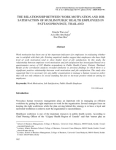 Wae-esor, Emeela and Abu Bakar, Azizi and Hoe, Chee Hee (2016) The Relationship between Work Motivation and Job Satisfaction of Muslim Public Health Employees in Pattani Province, Thailand. Journal of Global Business and Social Entrepreneurship (GBSE), 2 (1). pp. 162-171. ISSN 2462-1714