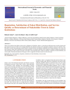 Zainal, Hafizah and Abu Bakar, Azizi and Saad, Ram Al Jaffri (2016) Reputation, Satisfaction of Zakat Distribution, and Service Quality as Determinant of Stakeholder Trust in Zakat Institutions. International Journal of Economics and Financial Issues, 6 (7s). pp. 72-76. ISSN 2146-4138