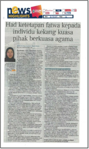 Mohd Noor, Noor Farihah (2025) Had Ketetapan Fatwa Kepada Individu Kekang Kuasa Pihak Berkuasa Agama. (6 July 2025). in Berita Harian, Bangsar, Kuala Lumpur, p. p. 10. (In Press)