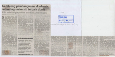 Mohd Sani, Mohd Azizuddin (2011) Gembleng Pembangunan Akademik Setanding Universiti Terbaik Dunia / IPTA Perlu Hasil Penyelidikan, Penerbitan Jurnal Berkualiti. (18 October 2011). in Berita Harian, Bangsar, Kuala Lumpur, p. p. 24. (In Press)