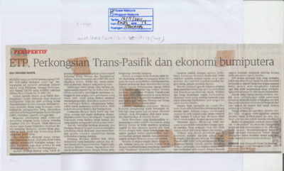 | Uncontrolled Keywords: | Rencana / ETP, Perkongsian Trans-Pasifik Dan Ekonomi Bumiputera penulisan Prof. Madya Dr. Rohami Shafie Pensyarah Kanan Pusat Pengajian Perakaunan Tunku Puteri Intan Safinaz Universiti Utara Malaysia |