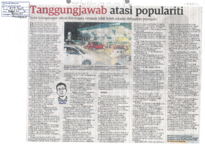 Shafie, Rohami (2013) Tanggungjawab Atasi Populariti : Demi Kelangsungan Rakyat Dan Negara, Kerajaan Tidak Boleh Sekadar Dahagakan Populariti. (8 September 2013). in Utusan Malaysia, Petaling Jaya, Selangor, p. p. 6. (In Press)