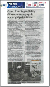 Haniffa, Mohamed Ali (2026) Galeri Rundingan Baling Dibuka Semula Pupuk Semangat Patriotisme. (3 January 2026). in Utusan Malaysia, Petaling Jaya, Selangor, p. p. 31. (In Press)